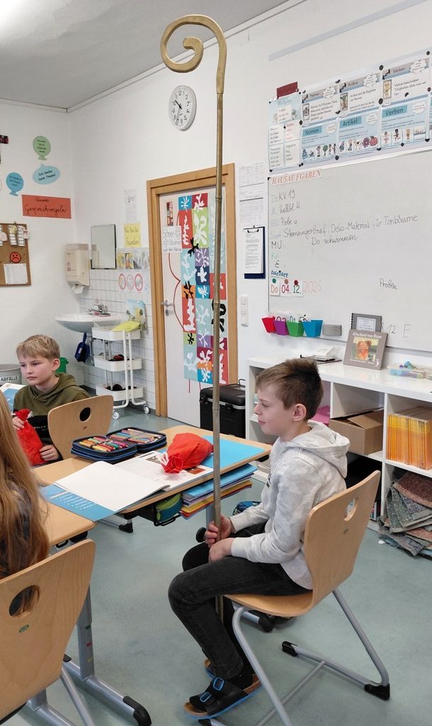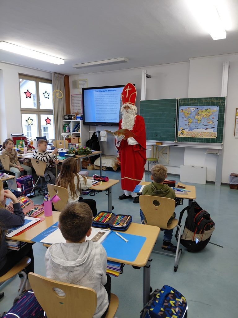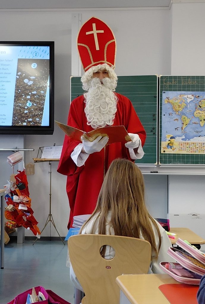 Auch in diesem Jahr besuchte der Heilige Nikolaus die Kinder aller Klassen. Er wusste viel zu berichten, weil die Engelein während des Jahres reichlich Informationen in seinem goldenen Buch vermerkt hatten. Zum Abschied hatte er für jedes Kind ein kleines Säckchen mit Geschenken dabei. Vielen Dank!