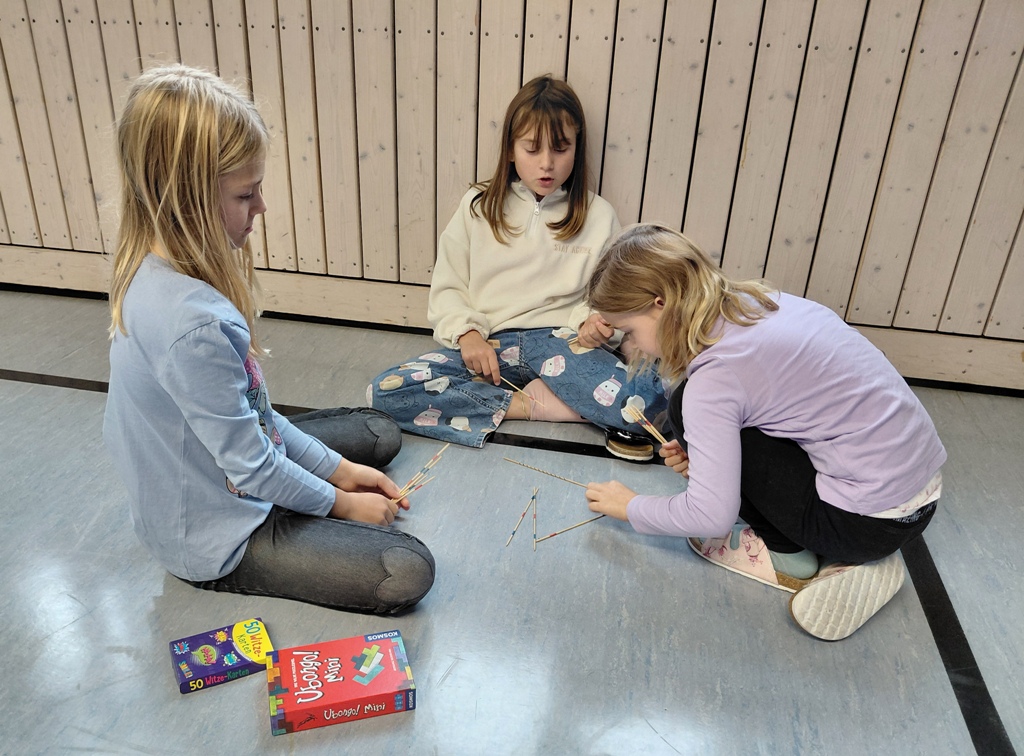 Die Paten der 4. Klasse überraschten ihre Patenkinder der 1. Klasse an diesem Tag mit einem mitgebrachten Spiel. In der Turnhalle fand sich genug Platz, miteinander die Spiele auszuprobieren.